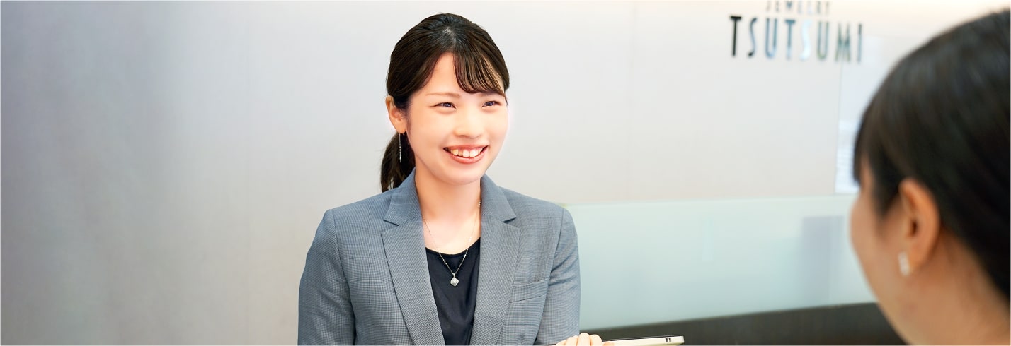 最終的にジュエリー業界を志望した理由は、誰かにとって特別な想いや幸せな気持ちを形に残せるジュエリーにとても魅力を感じたからです。そのなかでも、ツツミは幅広いアイテムがあり、さまざまな年代のお客様がご来店されます。他社にはないツツミの強みを知り、「よりたくさんのお客様のお役に立ちたい」、「ジュエリーを通じてお客様の人生に寄り添うジュエリーアドバイザーになりたい」と思い、ツツミに入社しました。