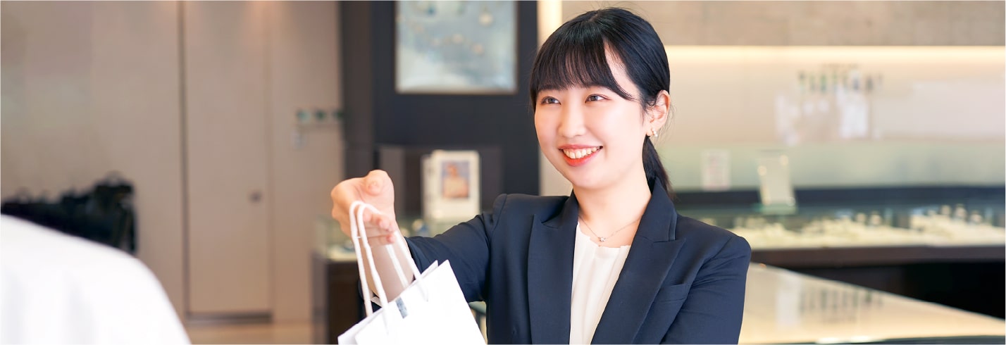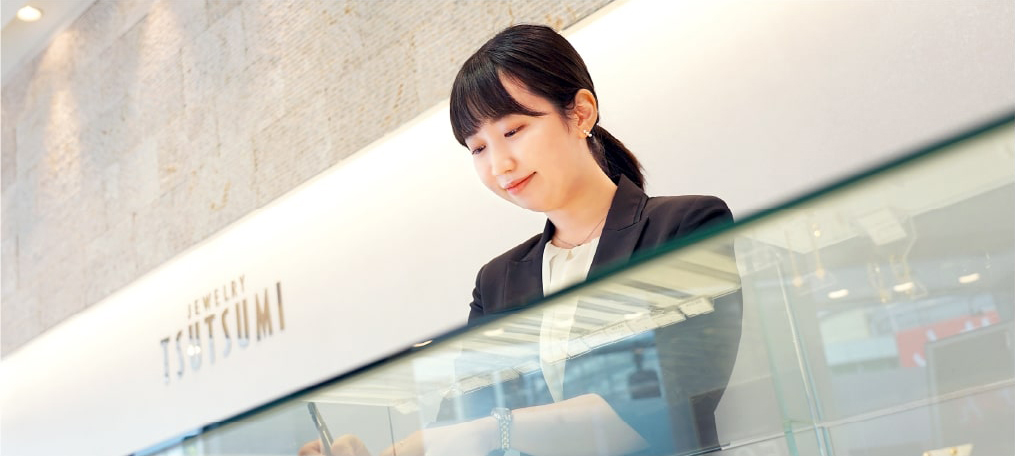 学生時代のアルバイト経験から「人と関わる仕事」がしたいと思い、特に業界を絞らずに就職活動をしていました。さまざまな企業があるなかでツツミを志望したきっかけは、私の成人祝いの品を選ぶためにツツミの店舗を利用したことでした。商品数が多く、長時間迷っていたにもかかわらず、スタッフの方は終始丁寧に対応してくださって、結果、満足のいく指輪を選ぶことができました。それが印象に残っており、私もツツミで「お客様一人ひとりに寄り添って、笑顔をつくれるような人になりたい」と思いました。